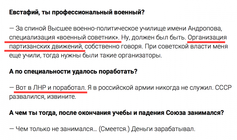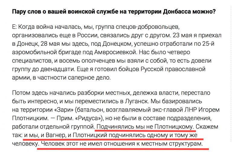 2. Далее интересный отрывок о том, как сам Ботвиньев-Шустров попал на Донбасс. Здесь стоит обратить внимание на такой фрагмент — Инженер говорит, что и он сам, и Вагнер, и Плотницкий подчинялись некоему человеку, который не имел отношения к местным структурам. Конечно, это не открытые. Никто и не сомневался, что Плотницкий всегда был пешкой. Но всякое новое свидетельство для нас важно. Чем больше таких показаний — тем лучше. Ведь если подтверждается, что Плотницкий подчинялся какому-то человеку, не имевшему отношение к местным структурам, значит он представлял в Луганске интересы этого человека, а никак не жителей Луганского региона. Не было гражданской войны, не было восставших шахтеров и трактористов. Были российские наемники с украинскими паспортами, которые выполняли приказы российских командиров.