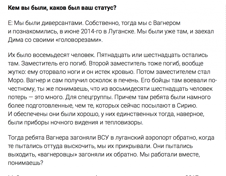 Важно отметить, что в Луганске Вагнер появился в июне 2014. Когда там только начиналась война. В его отряде было 80 человек — это немного для нынешнего периода войны, но это много для самого начала конфликта, когда в Луганске едва ли набиралось несколько сотен боевиков. То есть, российский отряд был очень весомой силой и принимал участие в самых главных сражениях.