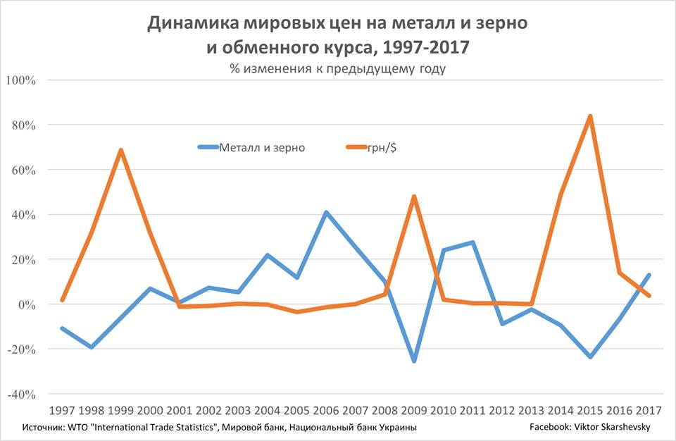 Если повышаются мировые цены на металл, руду и зерно - курс гривны стабилен (2001-2007, 2010-2013, 2017).