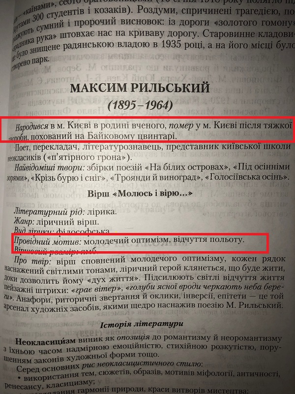 А мы должны понимать, что образование напрямую завязано на перспективы страны. Поэтому нужно очень жестко поднимать эти вопросы — чему учат наших детей. Достаточно изучить официально утвержденные планы по тому или иному предмету, чтобы увидеть, какие социальные проблемы нас ожидают в будущем. Например, количество украинского языка и литературы сейчас в существенно больше, чем правоведения или информатики (причем большой вопрос что это за информатика, точнее говоря, проще сказать, что ее нет). Получается, что человека в нашей стране с самого малолетства приучают к бесправию. Ведь он не знает своих базовых прав, потому что обществоведение на минимальном уровне, но по ходу ему вдалбливают знания «молодечого оптимізму Рильского» (скан из учебника по подготовке к ВНО 2018 по украинскому языку и литературе) для того, чтобы потом дальше говорить на суржике.