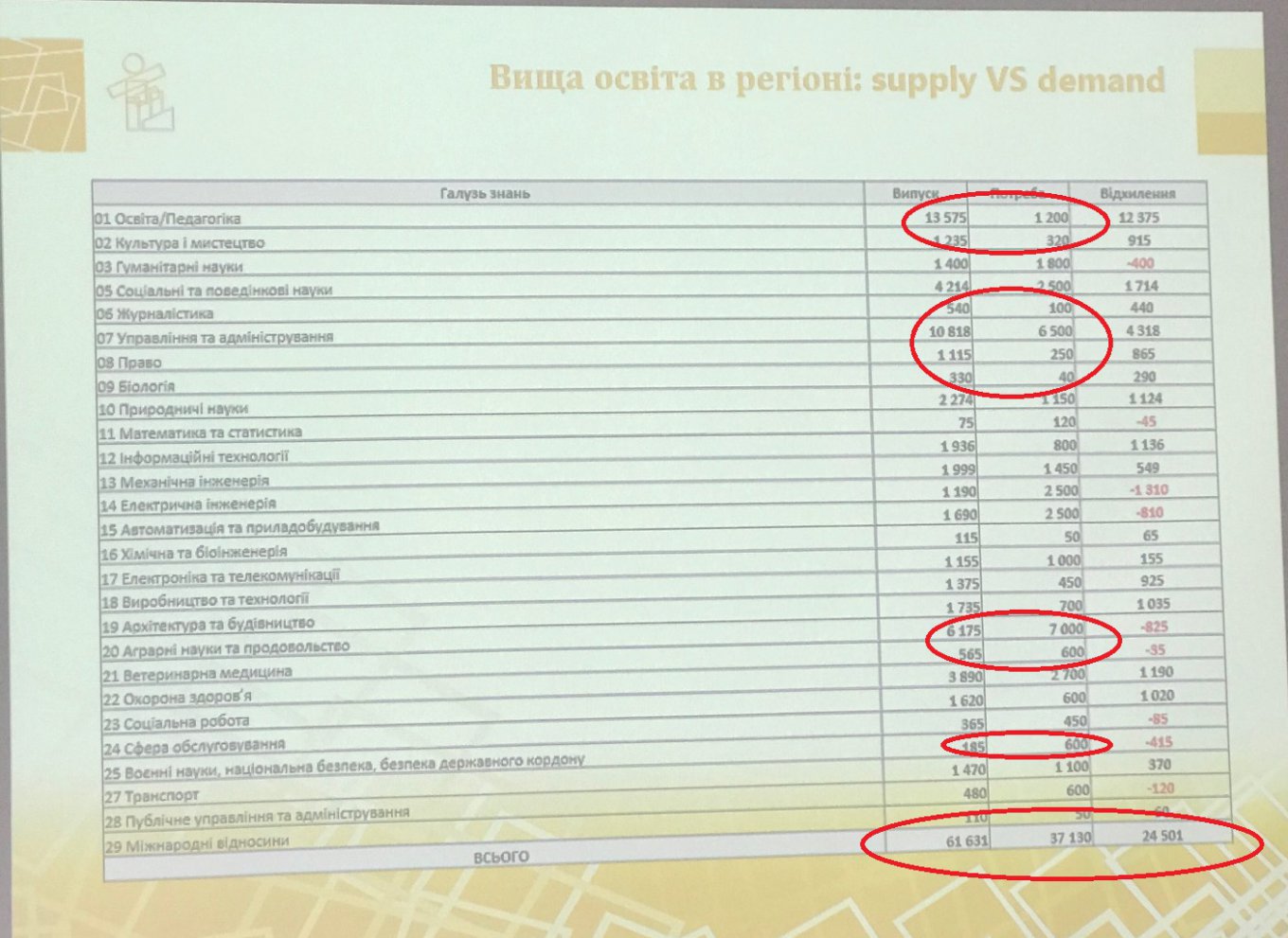 Да, ВНО — создает видимость ликвидации коррупции (хотя в 2016 году был большой скандал, когда стало известно, что были подделаны данные 2000 анкет через сервера), но коррупция дальше остается в ВУЗах. Вся суть ВНО нацелена на то, чтобы дети, получая высокие баллы, проходили на бюджет, а дальше… пять лет протирали штаны. Ключевой вопрос – зачем тратить пять лет жизни на учебу в ВУЗе, когда… 80% выпускников не работают по специальности? Как сказал мне бизнесмен в Житомире, «у меня на новой роботизированной линии стоит 200 человек из которых 112 человек с высшим образованием. Я их спрашиваю, зачем вам было получать высшее образование?». В той же Житомирской области в год выпускают более 13 тыс. педагогов при необходимости в 1200. Зачем? Просто, чтоб поддерживать занятость ненужных ВУЗов, создавая новых безработных, которые пополнят рынок разнорабочих в Польше. Вот посмотрите диспропорции на примере Житомирской области. Хорошо видно, что фактически половина выпускников не востребованы уже к моменты выпуска. Они просто не нужны рынку труда.