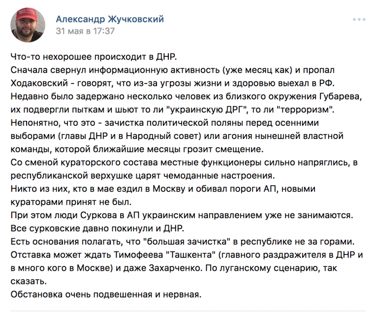 Откуда взялись эти слухи — понятно. В мае Владислав Сурков был отстранен от кураторства над ЛДНР. А поскольку Захарченко является ставленником Суркова, то шансы разделить судьбу куратора у него тоже чрезвычайно высоки.