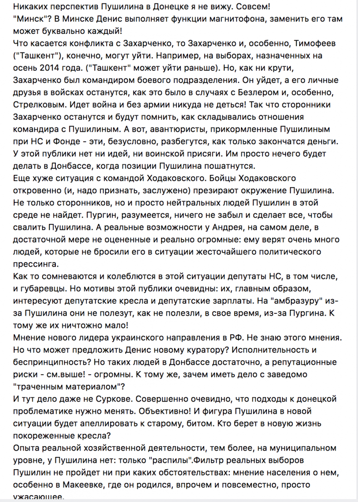 «По своей природе, происхождению, образованию, жизненному опыту, Пушилин — хитрый, но крайне глупый человек. Вряд ли в своей жизни он прочел два десятка книжек. Максимально доступный ему уровень общения в Москве — злобная и завистливая мошкара, вившаяся у кабинета Суркова на Старой площади», — пишет о Пушилине ДНРовец Роман Манекин.
