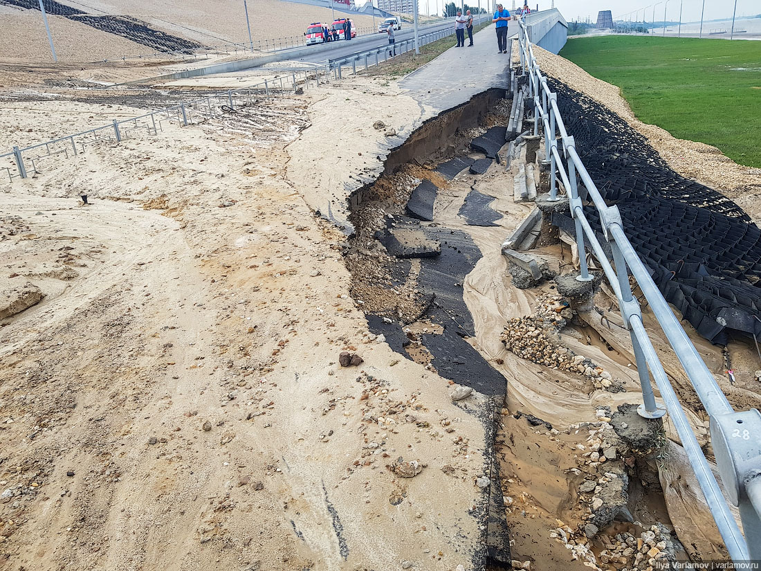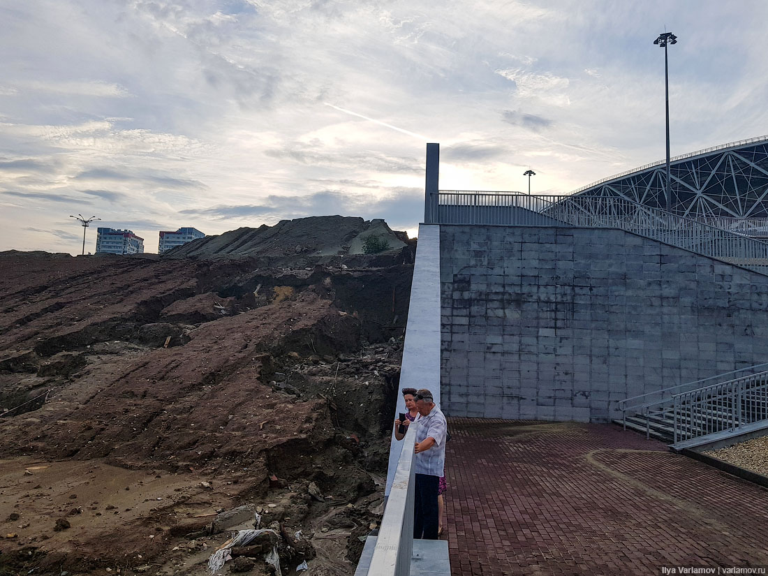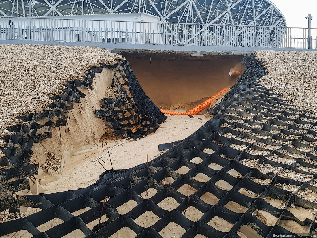Сейчас вам начнут рассказывать, что это ЧП, что так бывает. Но в нескольких сотнях метров от стадиона в Волгограде стоит знаменитый мемориальный комплекс Мамаев Курган, и его десятки лет не смывает. Дома, построенные сотни лет назад, не рушатся, если их не сжигать и не сносить. Дороги, построенные древними римлянами, кое-где до сих пор стоят. Плитка в Калининградской области, которую клали немцы до войны, до сих пор лежит, и ничего с ней не случилось за 80 лет. А тут первый дождь и все смывает.