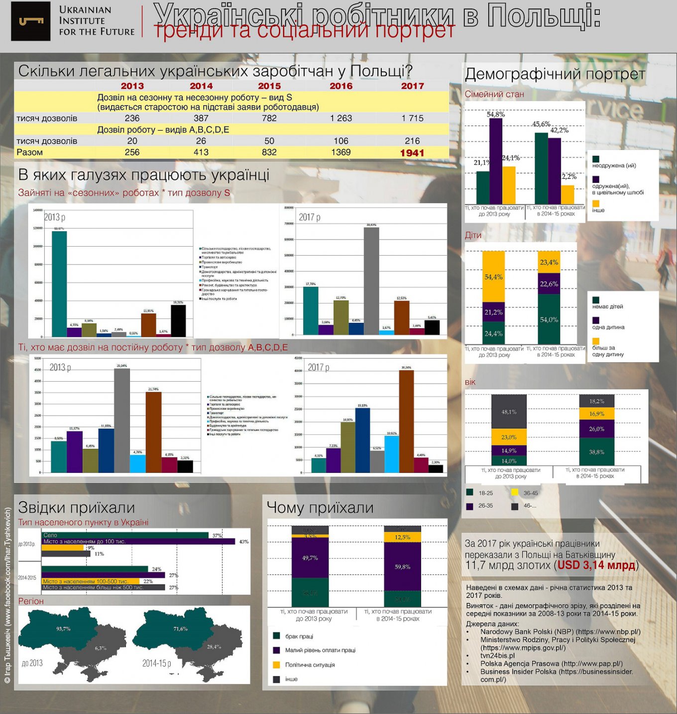 Структура работников изменилась за 2014-17 годы. Изменился и характер их пребывания — всё большая часть остаётся в стране на долгий срок. Но всё равно, если брать «заробитчан» в общем, значительная их часть (по данным, например, упомянутого исследования компании Personnel Service 73,8%) не намерена оседать в стране. При этом украинцы активно переводят деньги на Родину — за 2017 год было отправлено более 3,14 млрд долларов. Интерес Польши в том, чтобы эти деньги остались в национальной экономике. И, поскольку иностранные работники должны отправлять средства семьям — семьи надо перевезти в страну.