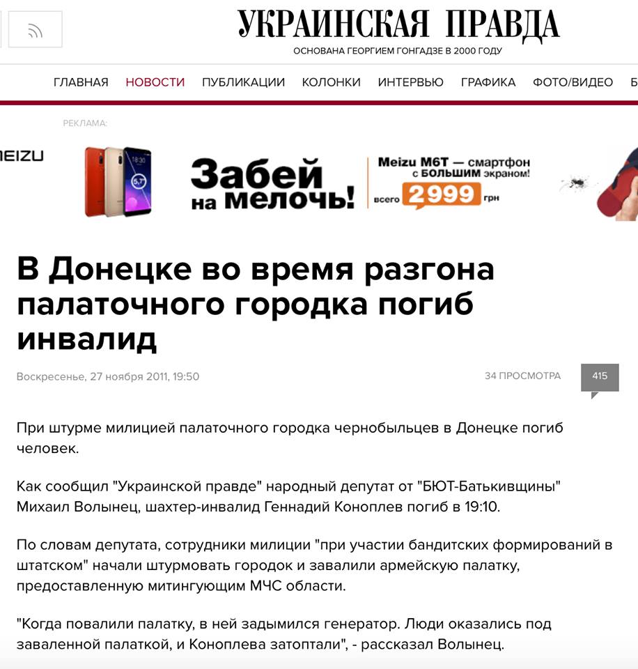 Самый жесткий разгон тогда был в Донецке. Ликвидаторы разбили палаточный городок у здания пенсионного фонда, но местные власти терпеть такой "майдан" не стали. 27 ноября городок был жестко зачищен милицией и титушками. При штурме погиб пенсионер Геннадий Коноплев, который не успел выскочить из палатки и был буквально затоптан нападавшими.