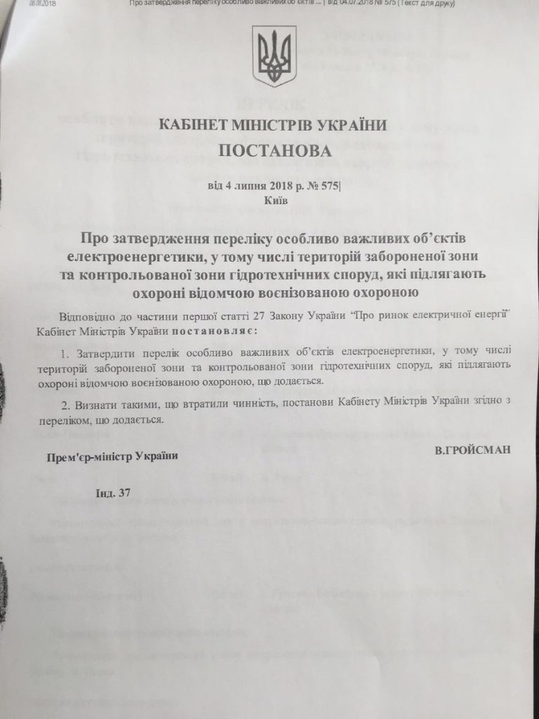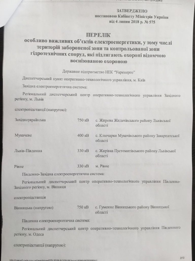 Знакомый прислал документ — постанову Кабмина «Про затвердження переліку особливо важливих об’єктів електроенергетики, які підлягають охороні відомчою воєнізованою охороною».