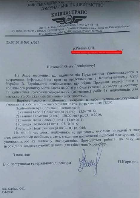 В 2016 году КП Киевпастранс закупило 18 подъёмников для людей с ограниченными физическими возможностями для установки на станциях скоростного трамвая. Стоимость одного 578 тыс.грн, всего на сумму 10 млн 404 тыс.грн. Работы включали в себя монтаж, пусконаладку и запуск в эксплуатацию. Были подписаны акты выполненных работ, и заключены договора на охрану этих подъёмников (на 2016,2017,2018 гг) с охранной фирмой, в частности Договор на охрану на 2018 год на сумму 7 млн 169 тыс грн. На бумаге всё хорошо и идеально, но… Дальше все, как всегда.