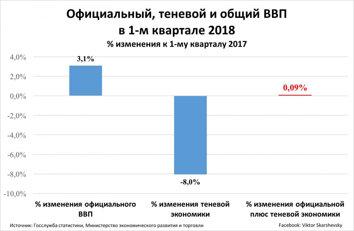 Сопоставляем эти данные и получаем, что общий ВВП (официальный плюс теневой) в первом квартале 2018 года изменился всего-лишь на 0,09%.