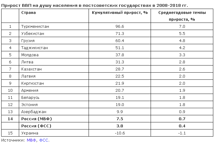 По этому показателю среди 15 постсоветских государств Россия в 2008-18 гг. оказалась на предпоследнем, 14-м, месте.