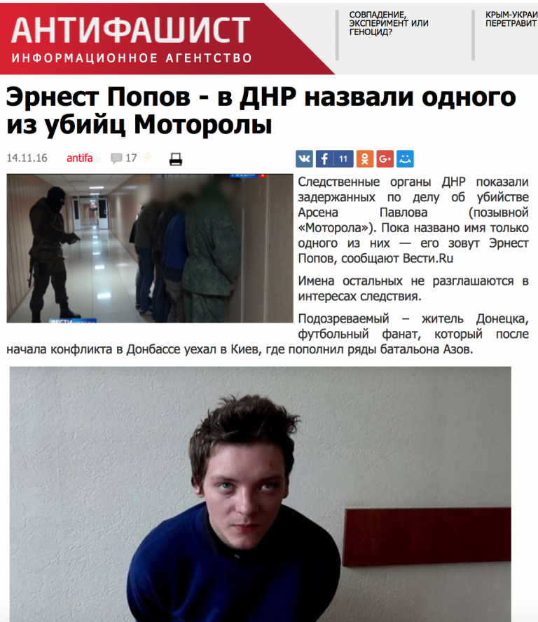Боевики поймали и снимали на видео левого чувака. Киселев скормил российскому телезрителю эти помои. После этого про Мотороллу все забыли, а Эрнеста Попова отпустили гулять дальше. В 2017 году он выкладывал веселые фоточки на своей страничке в ВК, где он зарегистрирован под именем Эрнест Донецкий