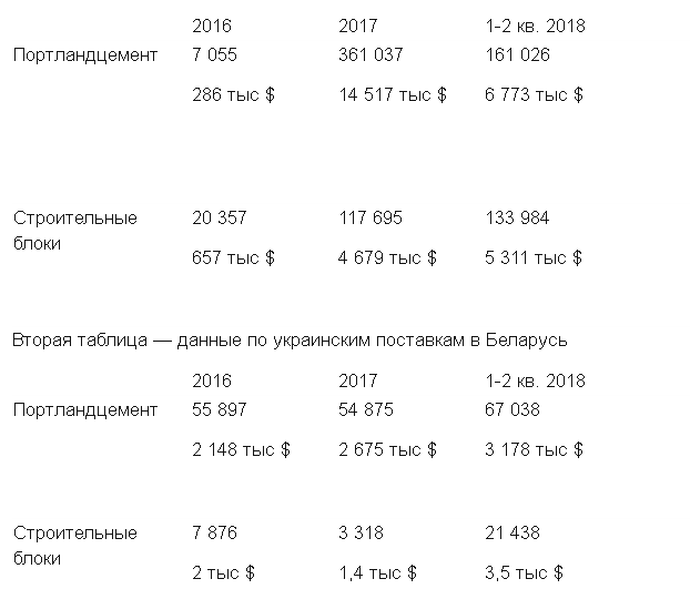 Ниже привожу данные торговли цементом (различных марок) и цементными изделиями между Беларусью и Украиной. Первая цифра — объёмы в тоннах, вторая — стоимость в тысячах долларов.