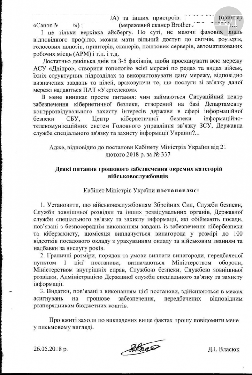 Что же касается Власюка, то после обращений в РНБО и СБУ его полностью отключили от сетей АСУ «Дніпро», организовали проверку Генштаба и угрожают ему криминальным преследованием…