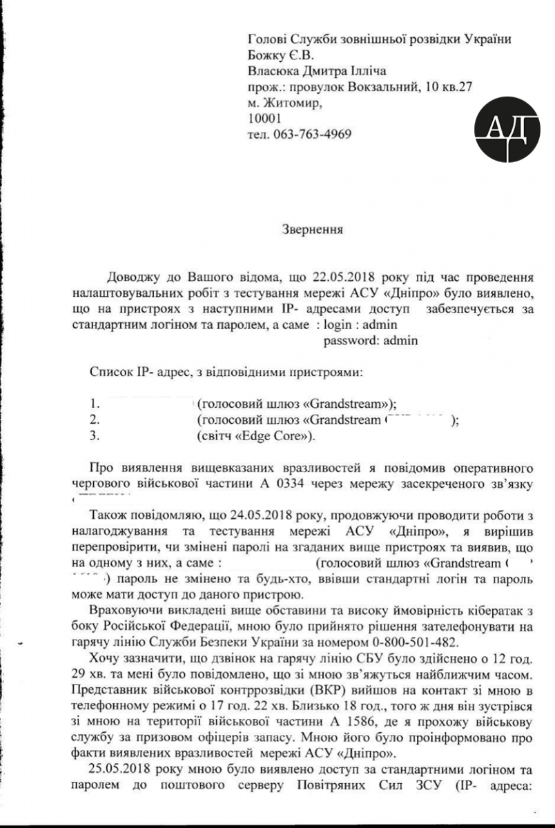 Согласно имеющихся в моем распоряжении документов, 22 мая 2018 года во время настройки и проведения тестирования сетей Автоматизированной системы управления войсками «Днiпро» специалист по базам данных Дмитрий Власюк выявил, что на многих серверах и коммутаторах с IP-адресами доступ происходит по стандартному логину и паролю.