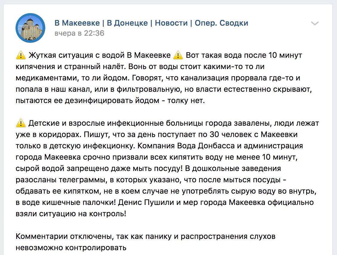В многострадальной Макеевке наступил развал коммунального хозяйства. В городе массовое отравление водопроводной водой. Судя по всему, в водопровод попали сточные воды. Десятки человек в больницах. Проблему уже признали на официальном уровне - Пушилин собирал экстренное совещание. Но вряд ли это поможет.