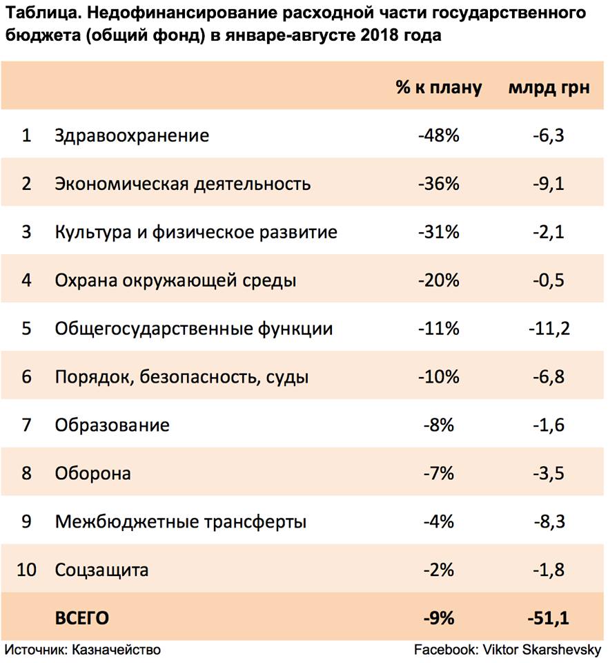 Кроме этого, за 8 месяцев 2018 года расходная часть государственного бюджета (общий фонд) недофинансирована на 51,1 млрд грн или на 8,5% от общих расходов (см. Таблицу).