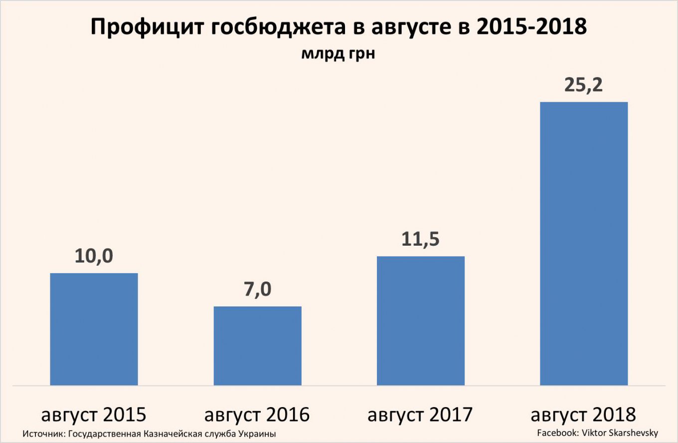 – профицит государственного бюджета за январь-август 2018 составил 11,8 млрд грн. Еще в январе-июле 2018 госбюджет был сведен с дефицитом 13,4 млрд грн.