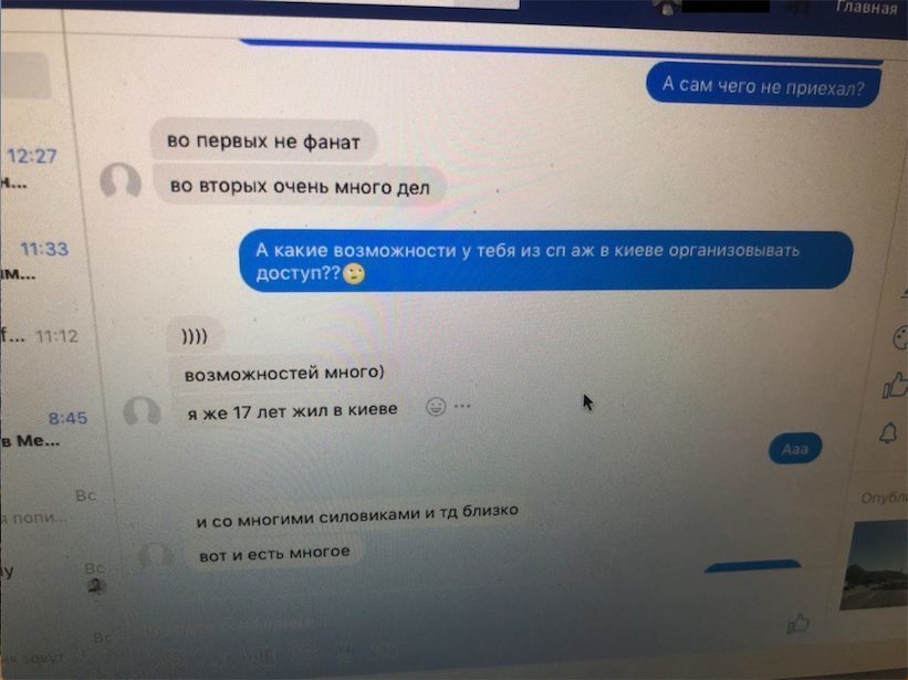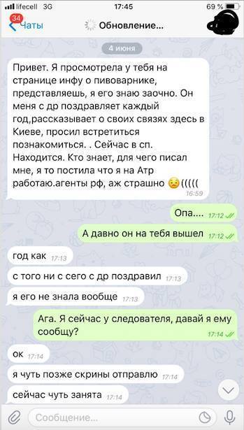 Коллега: «Привет. Я увидела у тебя на странице инфу о Пивоварнике, представляешь, я его знаю заочно. Он меня с др поздравляет каждый год, рассказывает о своих связях здесь в Киеве, просил встретиться познакомиться. Сейчас в Санкт-Петербурге находится. Кто знает, для чего писал мне, я то постила что я на АТР работаю. Агенты РФ, аж страшно»
