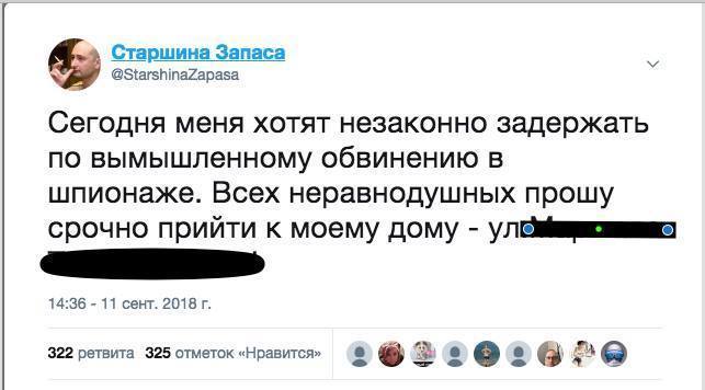28. «Сегодня меня хотят незаконно задержать по вымышленному обвинению в шпионаже. Всех неравнодушных прошу срочно прийти к моему дому по адресу …» - и дальше указан некий адрес.