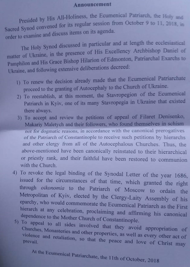 Текст решения на английском языке опубликовал в Фейсбук архиепископ Евстратий (Зоря). Всего пять пунктов, которые в корне меняют баланс сил церковных организаций в Украине.
