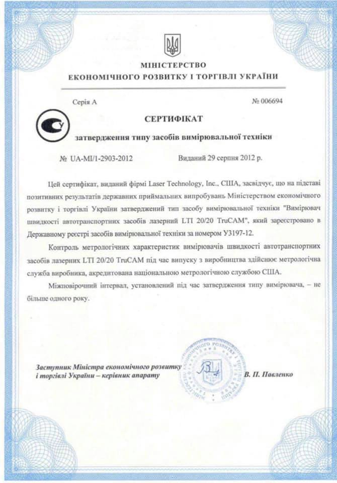 Этот прибор получил сертификат утверждения типа средств измерительной техники от 29.08.2012 № UA-MI/1-2903-2012. Соответственно, на основании положительных результатов государственных приемочных испытаний Министерством экономического развития и торговли Украины утвержден тип измерительной техники "Измеритель скорости автотранспортных средств лазерный LTI 20/20 TruCAM", который был зарегистрирован в Государственном реестре средств измерительной техники за номером У3197-12.