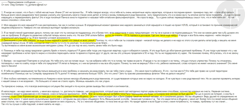 Олег Гонтарев в сентябре 2013 года ведет напряженную переписку с Валерией Гонтаревой, в которой и проясняется причины возникновения миллионного долга: когда Олегу надоело заниматься банковской деятельностью, он создал проект, который связан з музыкальной индустрией – «Клуб», но поскольку тот оказался не прибыльным - был закрыт.