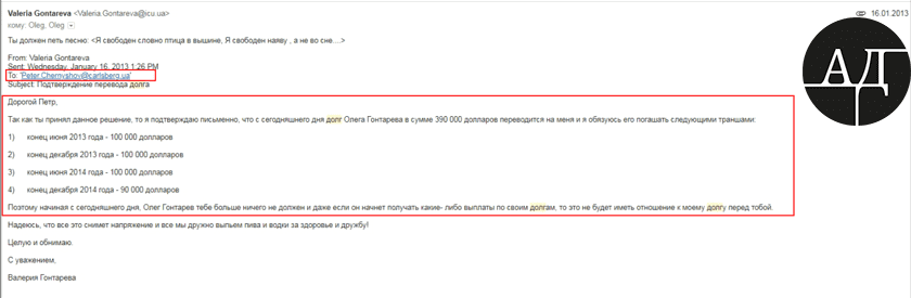 В письме Гонтарева сообщает, что с этого момента долг ее мужа Олега Гонтарева в размере 390 тыс. долларов США полностью переводится на нее, и она обязуется его погасить – до декабря 2014 года по такому графику: июнь 2013 года - 100 тыс.дол. США, декабрь 2013 года – 100 тыс. дол. США, июнь 2014 года - 100 тыс. дол. США, декабрь 2014 года - 90 тыс. дол. США).