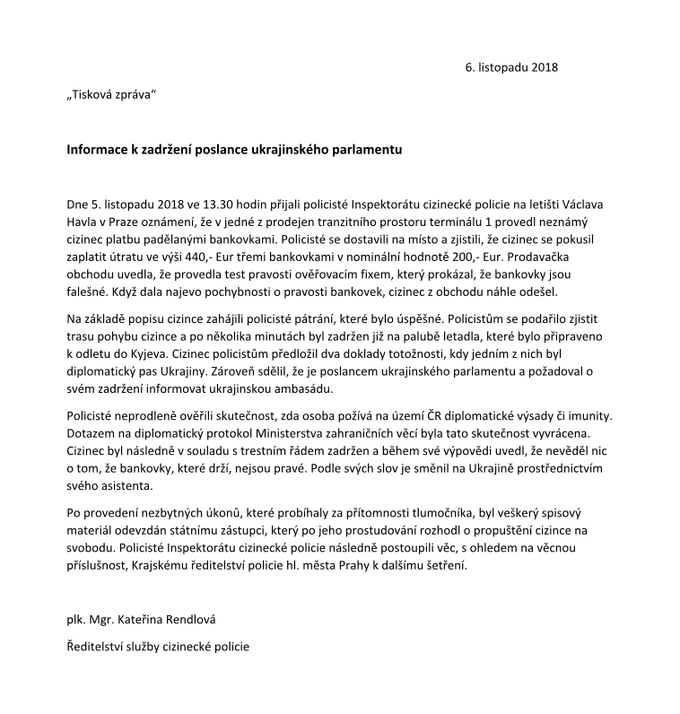 "Поліцейські прибули на місце і з'ясували, що іноземець спробував заплатити за товар 440 євро трьома банкнотами номіналом 200 євро. Продавчиня магазину сказала, що провела тест на справжність спеціальним пристроєм, який показав, що купюри є фальшиві. Коли вона висловила підозру щодо справжності купюр, іноземець з магазину швидко пішов. На підставі опису іноземця поліцейські почали пошуки, які були успішні"