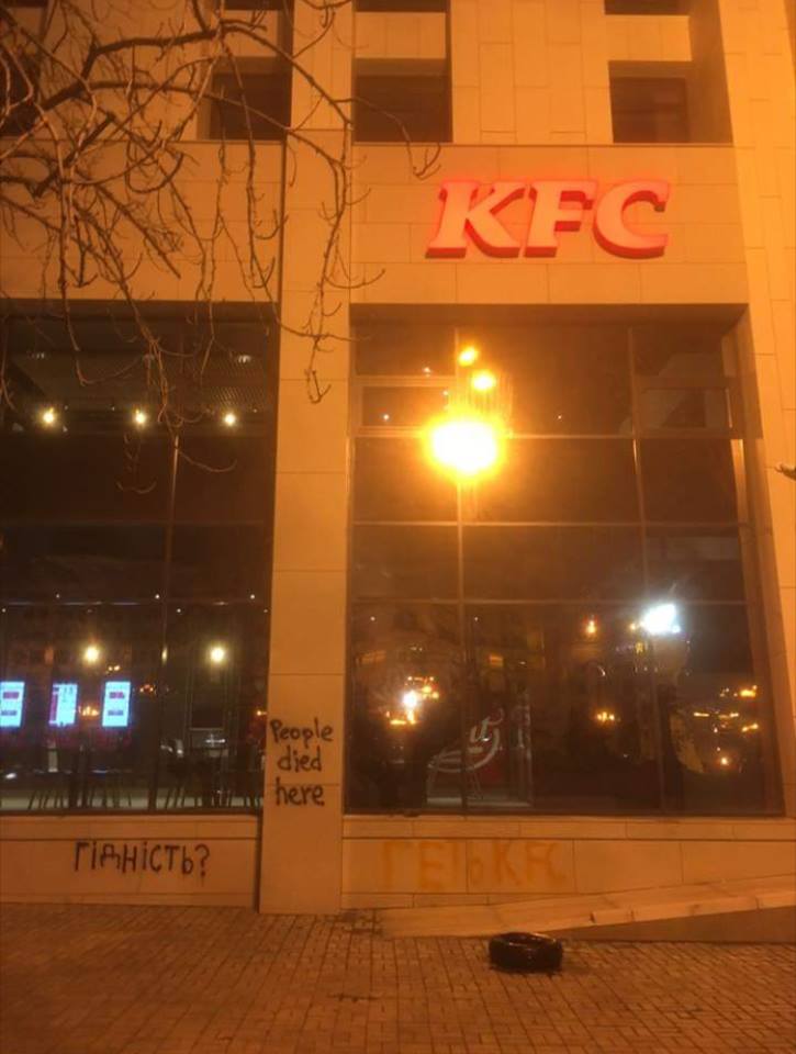 Натомість у Києві на 5 річницю початку Майдану в будинку профспілок, де горіли люди, відкрили кафешку KFC, слоган якої є "смажені курчата кентукі.»