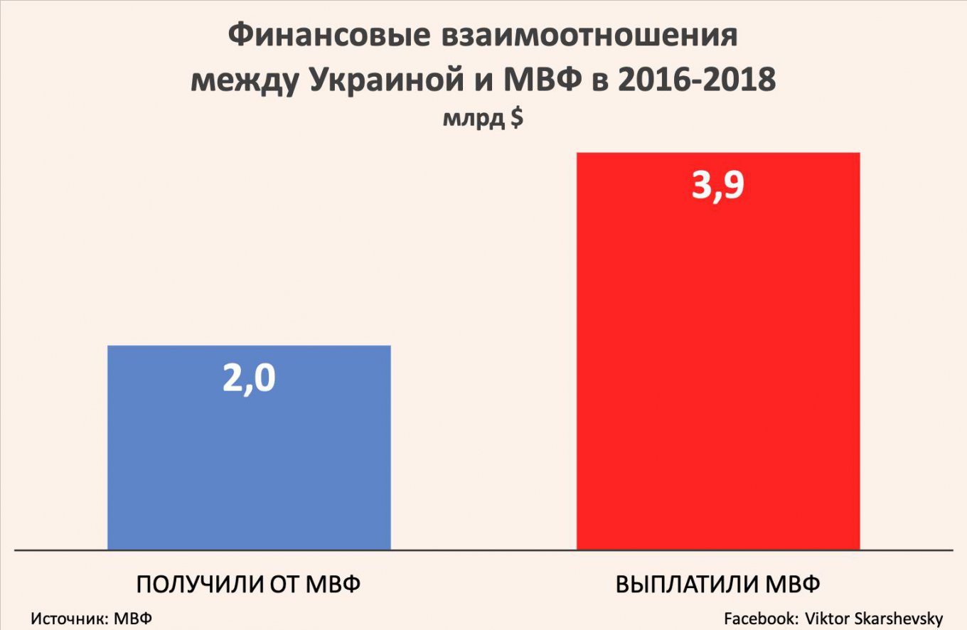 В 2019 году Украина должна выплатить МВФ $2,5 млрд, включая $280 млн процентов. Столько же, по новой программе сотрудничества с МВФ, Украина в 2019 году должна и получить от МВФ.