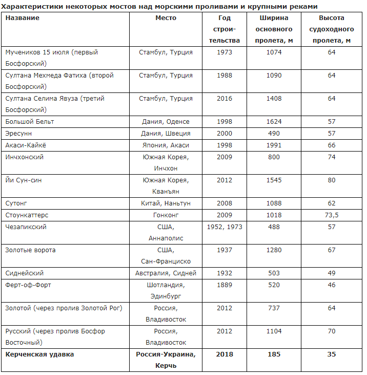то есть в два с половиной раза больше, чем у Керченского моста (при наличии у Эресунна большого количества неосновных проходов, а также при существовании моста над Большим Бельтом, дублера Эресуннского моста, с 1624-метровой шириной основного пролета).