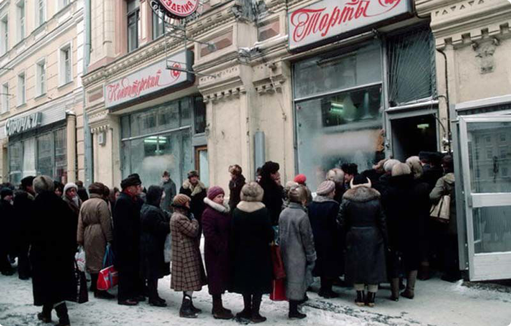 Вот этот кадр снят как раз в очереди за тортами — хвост очереди стоит на улице, а на заднем плане фото можно увидеть, как из магазина выходит счастливый покупатель, победоносно подняв в верх две руки с честно отвоёванными тортами — чтобы их не помяли при выходе. Если домой предстояло ехать на советском общественном транспорте — то рука с советским тортом взвивалась над толпой ещё выше.