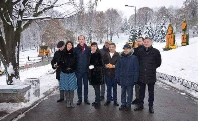 И последнее. Знаете на что можно пустить 15 тонн стали, 120 тонн апельсинок, мандаринок и лимонов? Думаете, что сталь на мост, а мандаринки нуждающимся? Нет! Чиновники киевского коммунального предприятия "Зеленстрой" решили, что лучше из них на морозе построить «Скульптуры из цитрусов», поставить на Певческом поле, и брать на вход на этот лютый ад 100 гривен! Всё это обошлось городу в 4 миллиона гривен. А потом все это надо будет еще утилизировать. Так что на это тоже денег потом спишут. А ведь эти деньги - это стоимость замены многих десятков опор на Куренёвке и стоимость обучения и дефибрилляторов на каждую станцию метро. А на что эти деньги можно потратить в воюющей стране вариантов просто множество. Выкладываю фотографию улыбающихся креаклов, которые эту цитрусовую хрень придумали и сделали за наши с вами деньги.