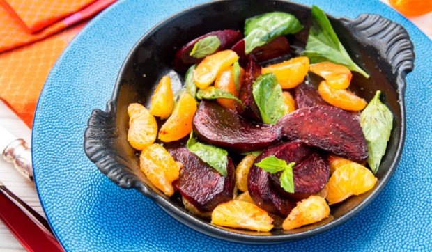 "Какой же Новый год без запаха мандаринов? Я предлагаю не отказываться от этой красивой и главное полезной традиции. Но просто есть мандарины, мне кажется, скучновато, хотя и вкусно. Поэтому я предлагаю приготовить салат из мандаринов ... и со свеклой! Наверное, вы удивитесь такому сочетанию, но это только до тех пор, пока вы не попробуете его. Ну, а чтобы окончательно поразить ваши вкусовые рецепторы, я добавлю в него листья свежего базилика. Я специально не прописываю количество ингредиентов, вы можете экспериментировать и найти вашу идеальную пропорцию. Итак, наш праздничный салат со свеклой и мандаринами готов. Заметьте, без мяса и майонеза, но в этом его основная идея", – Евгений Клопотенко.