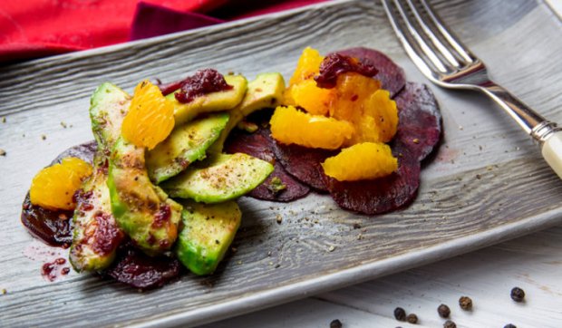 5. Для подачи салата сначала выкладываем на тарелку свеклу, затем авокадо, мякоть апельсина и поливаем винным соусом. Солим и перчим по вкусу.