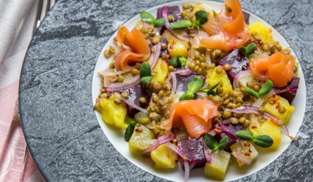 "Винегрет – еще одно блюдо, которое не дает мне покоя. Признаюсь честно, что классическая советская интерпретация этого салата мне не очень нравится, поэтому я поставил себе цель изменить рецепт так, чтобы он приобрел совершенно другой вкус. Горошек или фасоль я решил заменить на зеленую чечевицу, в заправку добавить острый перец, чтобы придать пикантность. И совсем немного красной рыбы, чтобы придать блюду праздничности. Получилось очень и очень вкусно, очень рекомендую приготовить", – Евгений Клопотенко.