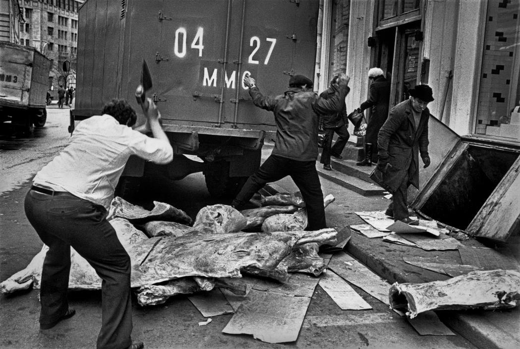 1.. Советский магазин, фотоснимок называется "мясо привезли". Собственно, уже одна эта фотография показывает отношение к людям и к торговле продуктами при "социализме" — мясо попросту свалили из фургона на какие-то грязные картонки, и рубят топором прямо на земле. Разумеется, всё это пойдёт потом "на зал" — то есть, простым покупателям из народа. Заведующие магазином и продавцы давно отложили для себя более-менее приличные кусочки, а в продажу пойдут вот эти мёрзлые кости, рубленные топором прямо на земле.