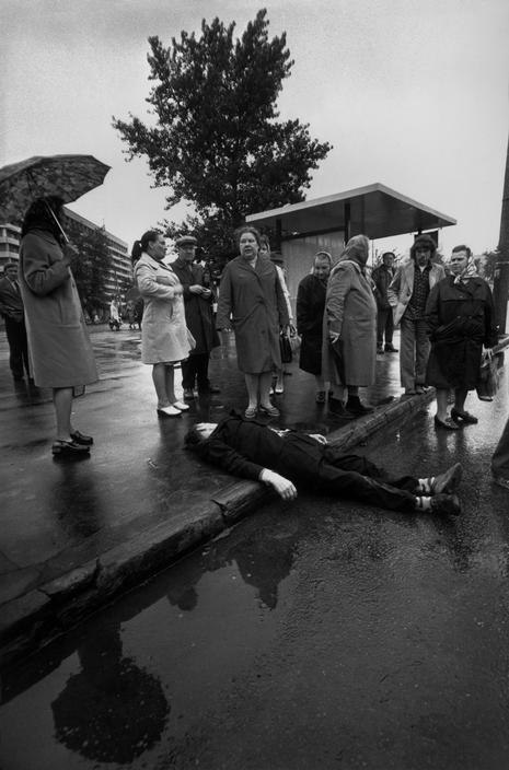13. И вот тоже замечательный снимок — алконавты начинают драку прямо у дверей магазина. Надо сказать, что в СССР существовал целый пласт "магазинной пьяни" — которые то ли по причине бедности, то ли по причине жесточайшего контроля семейного бюджета женой постоянно околачивались у дверей магазина, с тоской побитой собаки заглядывая в глаза проходящих покупателей, стреляя мелочь "на поправить здоровье" и периодически устраивая вот такие драки с коллегами. Драка, кстати, чаще всего заканчивалась всеобщим примирением и грандиозной попойкой.