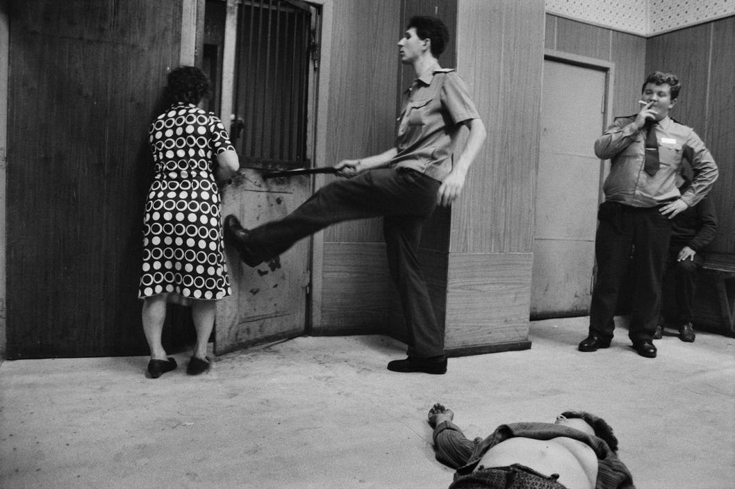 17. Иногда советские алкоголики попадали в милицию — где к ним было примерно такое отношение. Одна женщина уже лежит на полу, вторую советский мент пинками загоняет в "обезъянник". Старший по званию цинично курит сигаретку, молча одобряя такие методы.