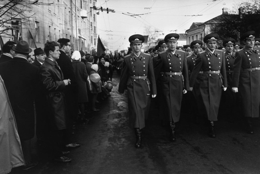 11. Парады, кстати, Георгий Пинхасов тоже снимал — вот только делал это по-своему. На этом снимке Георгия советский парад выглядит вовсе не как что-то торжественное, а как некое мрачное шествие людей в форме.