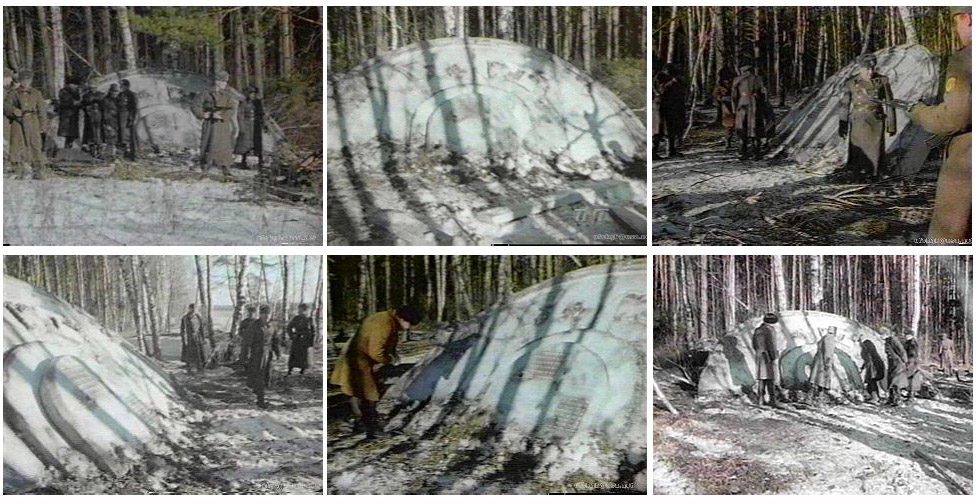 Некоторые истории о советских летающих тарелках имеют даже фото — вот эти кадры сделаны якобы во время "секретного оперативного исследования военными места крушения НЛО" в 1969 году под Свердловском. Однако при ближайшем рассмотрении снимков видно, что это никакое не место крушения — деревья вокруг целы, земля (точнее, бетонная площадка) целая и даже обросшая мхом. Да и сам диск мало похож на летательный аппарат — скорее всего, это нечто вроде крышки от шахтной пусковой установки, вся площадка и территория вокруг напоминает расположение дивизиона РВСН, а фото скорее всего сделано на учениях.