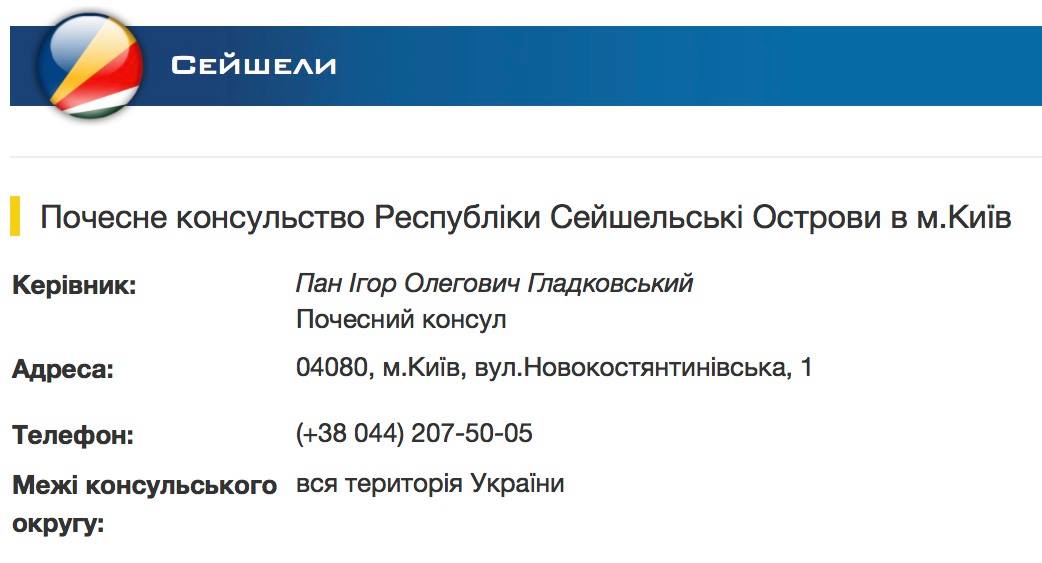 Кроме своей доли в откатах, Гладковский-старший переписал на своего сына должность почетного консула Сейшельский островов в Украине. Это значити, что молодое дарование пользуется дипломатической неприкосновенностью и может иметь дипломатический паспорт и дипломатический номер на автомобиле. Достаточно предусмотрительно на случай побега из страны.