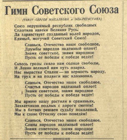 Собственно, самая первая версия гимна выглядела вот так. Гимнюк Михалков по своему обыкновению лизнул в ней Сталину, упомянув его лично в гимне в качестве "выращивателя на верность народу", а также "вдохновителя на труд и подвиги":