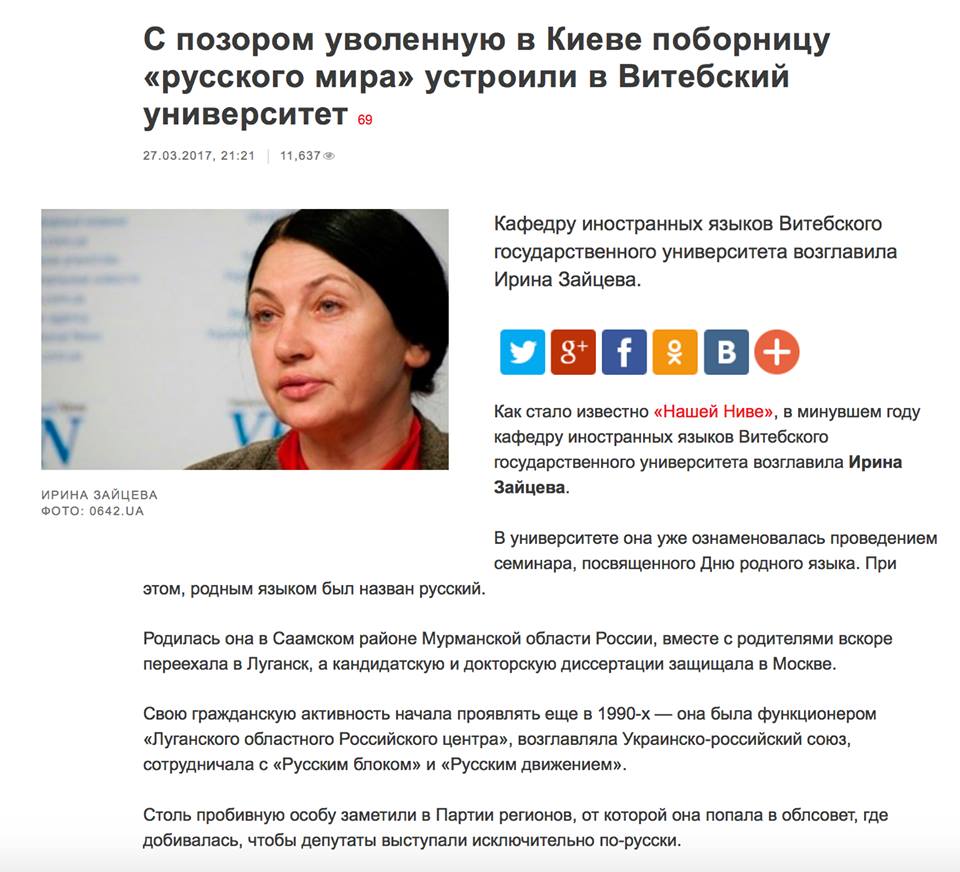 Только сейчас узнал, что одиозная луганская украинофобка Ирина Зайцева, которая раньше работала проректором Луганского института культуры и искусств, была депутатом Луганского облсовета от ПР, а после победы Януковича - заместителем министра культуры, теперь живет и работает в Витебске. В Беларуси.