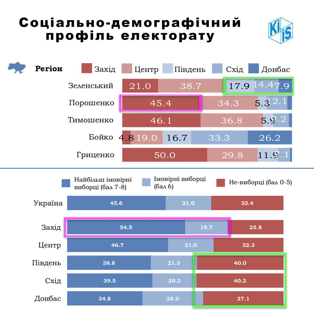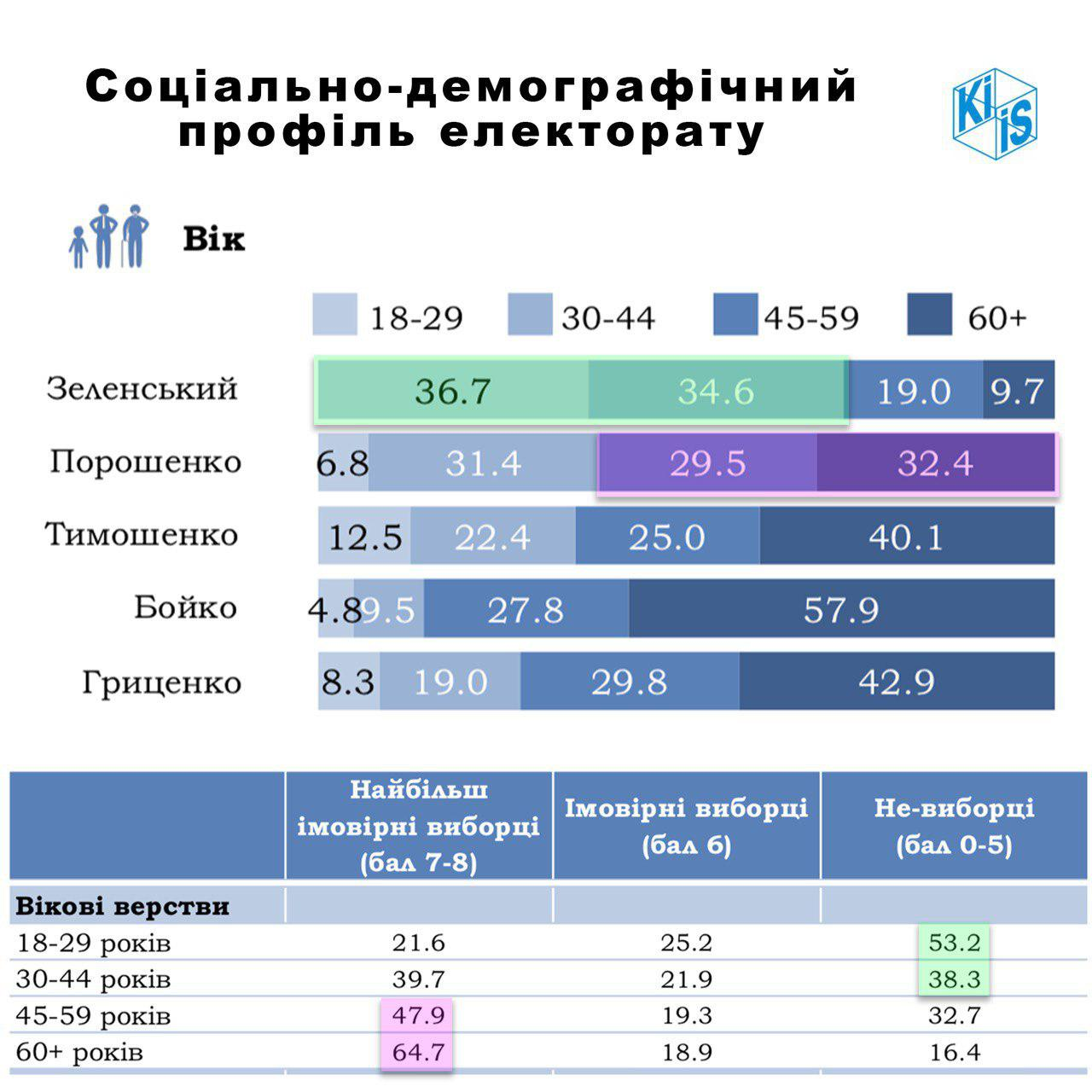 Примерно 70% избирателей Владимира Зеленского – это аудитория возраста 18-44 года. Согласно данным КМИС, примерно 53% избирателей 18-29 лет и почти 38% избирателей 30-44 года, на выборы вероятнее всего не пойдут.