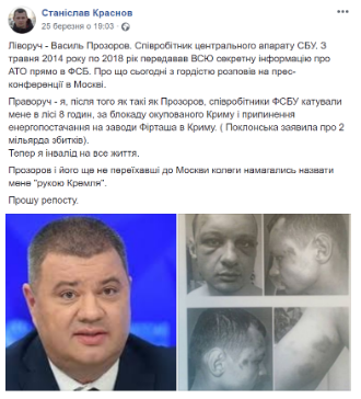 Чітко простежуються спроби росіян нав’язати українському суспільству тезу “СБУ - філіал ФСБ”. Буквально декілька днів тому подібний коментар на своїй сторінці в “Facebook” розмістив колишній міліціонер Сімферопольського УМВС Станіслав Краснов, який позиціонує себе як активіст низки українських націоналістичних організацій та був помічений у підготовці теракту та “зливі” інформації про сили АТО російським спецслужбам.