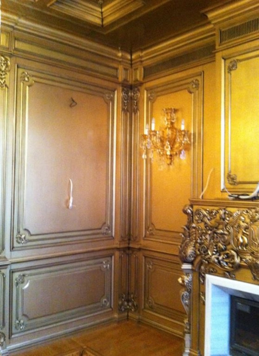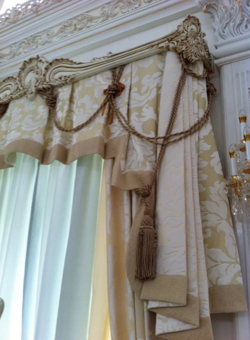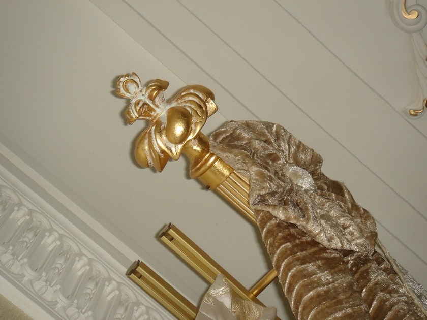 Ламбрекены на шторах и громоздкая лепка. Золотое напыление на поверхности стен.
