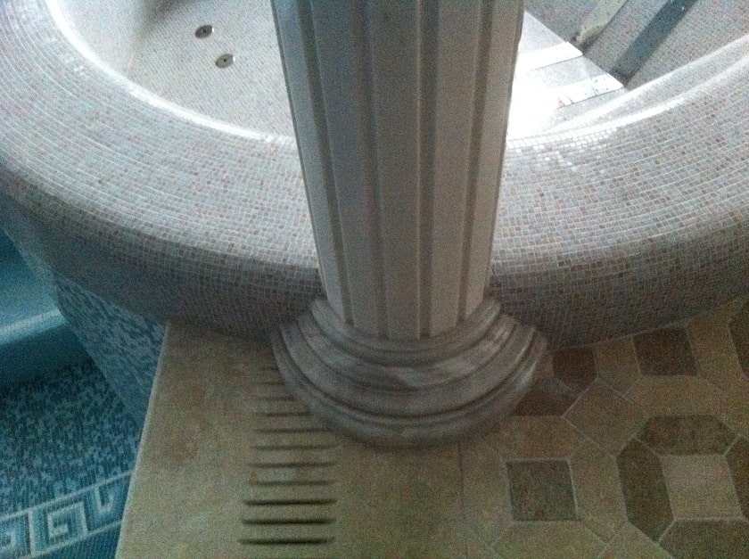 Огромные колоны в античном стиле украшают личный бассейн Порошенко. Красоту с одной стороны дополняет плиточная мозаика от джакузи, а с другой стороны мраморный монумент.