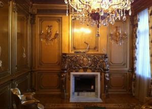 Отделка каминного зала сочетает в себе золото и дерево, а сам камин не вписывается в данный интерьер, что в очередной раз подтверждает безвкусицу Порошенко. Кроме того, вырезанные деревянные элементы над камином в виде герба и различных национальных элементов никак не сочетаются с итальянской мебелью.