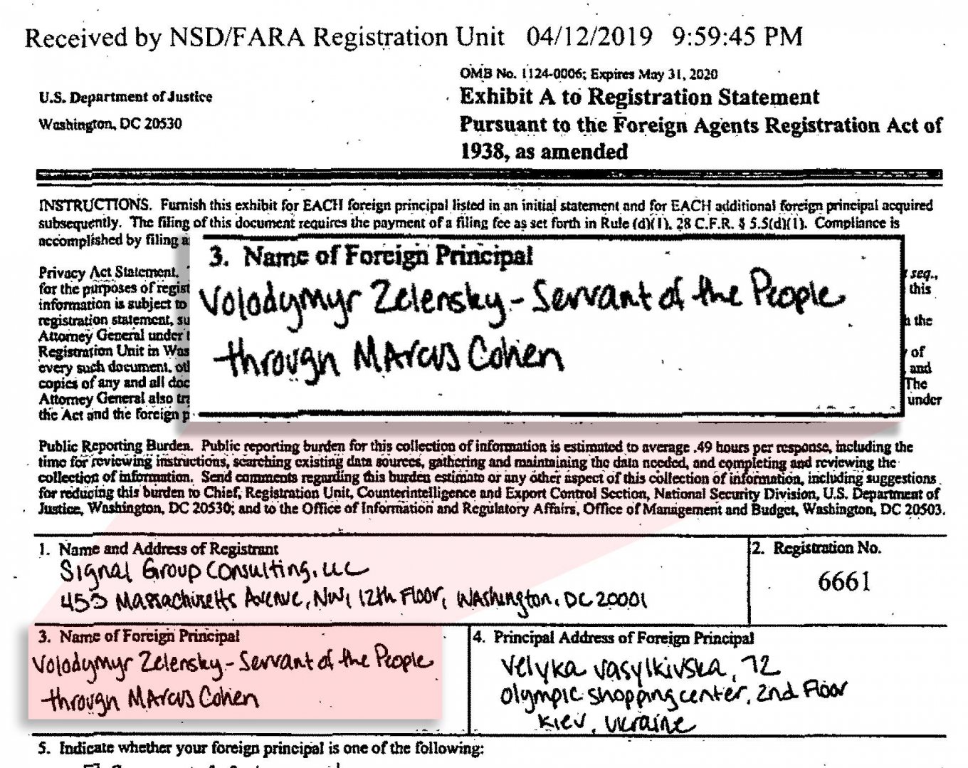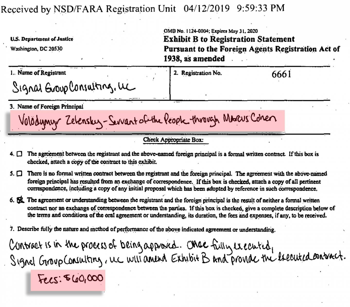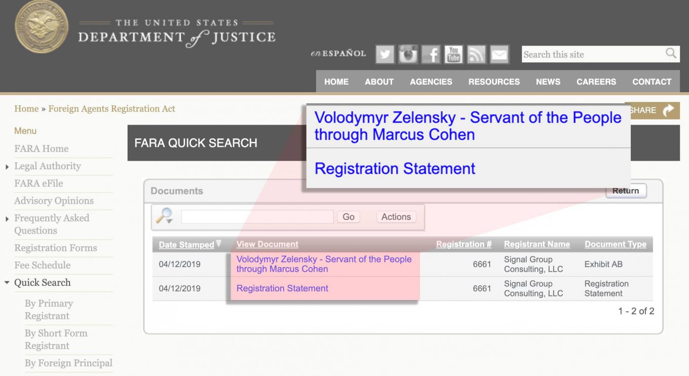 Все такие контракты находятся в открытом доступе на сайте Министрества юстиции США. К примеру, контракт Владимира Зеленского и компании Signal Group Consulting, LLC можно найти вот по этому адресу.